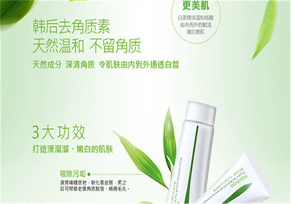 韩后嫩白去角质素采用天然竹炭成分而成,温和无刺激,一周使用1-2次就能很好的帮助肌肤去除杂质和污垢,使用后记得涂抹补水保湿护肤品,能令肌肤更加水嫩、细滑,具有温和磨擦作用。