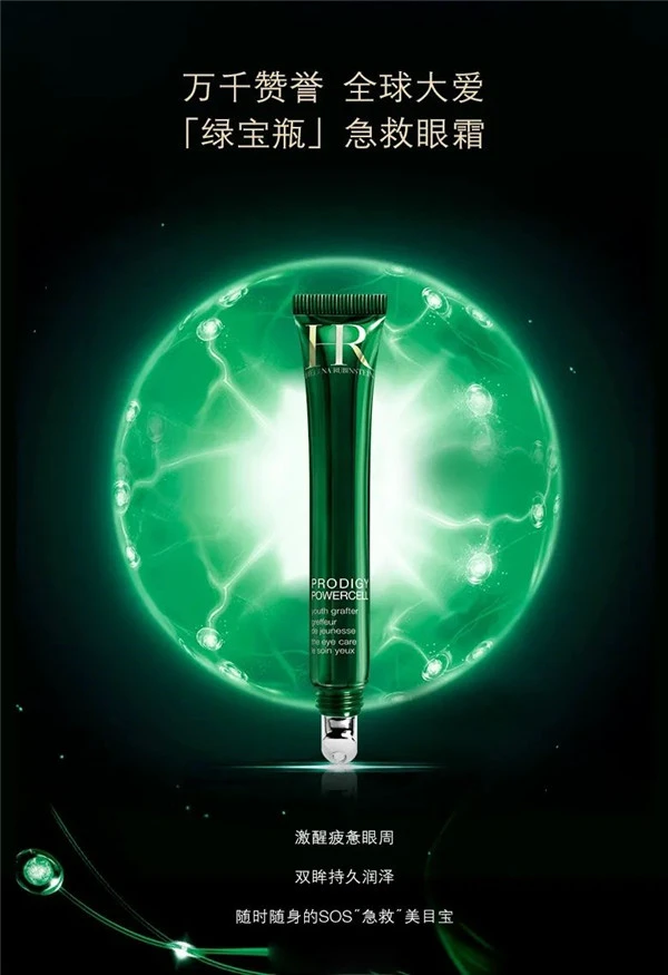 HR赫莲娜绿宝瓶亮采精灵眼部精华乳,海洋董原生细胞,强初眼周肌肤,舒缓疲态,珠光柔焦克眸复合物,提亮眼周,淡退黑眼圈,扎马克低温锌合金按摩头,顷刻降温改善眼周循环,抚平泡泡眼,击退浮肿。双效焕亮眼周科技 ,即刻点亮眼周、淡化细纹、妆前亮采打底;改善黑眼圈、抑制眼袋出现。 高精准按摩头,符合人体工程力学,使用更精准。 沁凉按摩头搭配乳液质地,涂抹瞬间即效激醒,长久保湿,隐退细纹淡化黑眼圈。挚EYE明星单品#绿宝瓶眼霜#告别“熊猫眼”,4周**实力淡褪黑眼圈!即刻帮你揭开它为EYE保鲜的秘密~灵魂成分「海洋堇原生细胞」加快眼周微循环;「VC衍生物」一扫眼周黯沉;「二裂酵母」修护强韧眼周。