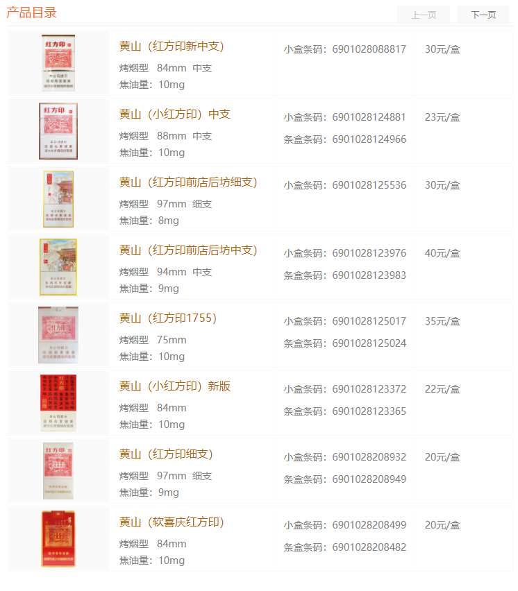 截止到海淘族小编的发布文章的日期,黄山红方印并没有一包100元的款式,黄山红方印旗各款的参考价格区间在20元——30元之间,属于中低档次的烟,不过并不排除后续的黄山红方印有推出100元的烟。如图所示: