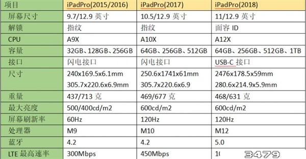 ipadpro一共有三代,第一代有9.7英寸和12.9英寸两个尺寸;第二代分成10.5英寸和12.9英寸;第三代的主要尺寸则是11英寸或12.9英寸。下面是三代ipad pro之间的区别对比图: