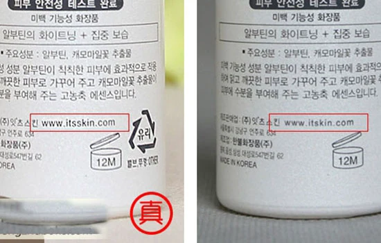 英文品牌名“it’s skin”,对比下品牌英文上的同点,正品的同点呈句号状,中间空心。反之假货的圆点却是实心的。小小的不同点,要细心看才能发现。