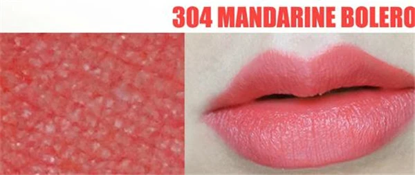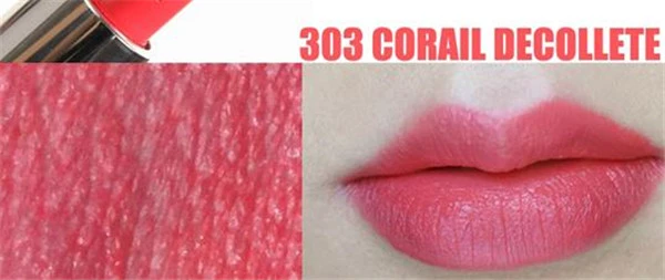 303 CORAILDECOLLETE。适合肤色:白皮、黄皮。这一只是韩国女生很喜欢的颜色,是带些粉红感的珊瑚色,饱满涂上以后是比较低调气质的红,压掉表面一层的粉红色会比较明显,这个色号有种柔软的天真淘气感,很软妹的颜色。