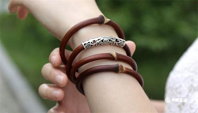 鸡血藤是一种著名的中药材,有袪风除湿的疗效。这种藤的韧皮部里密布分泌管,排列成赤褐色的圆环状。分泌管里充满着棕红色的物质,比如鞣质、还原糖和树脂等。用这种藤做成的镯子,即为藤镯。
