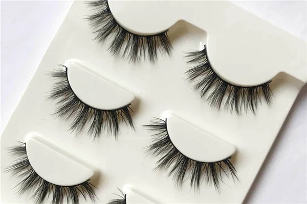 (2)人造纤维假睫毛:采用化纤合成、编织制成,结合磨尖工艺,纤维毛尾部被磨尖,粗细分明。这种睫毛的毛质较硬,排列整齐有序,弯曲度一致,光照下的睫毛光泽度比真毛类假睫毛高,自然度略低于真毛类假睫毛。