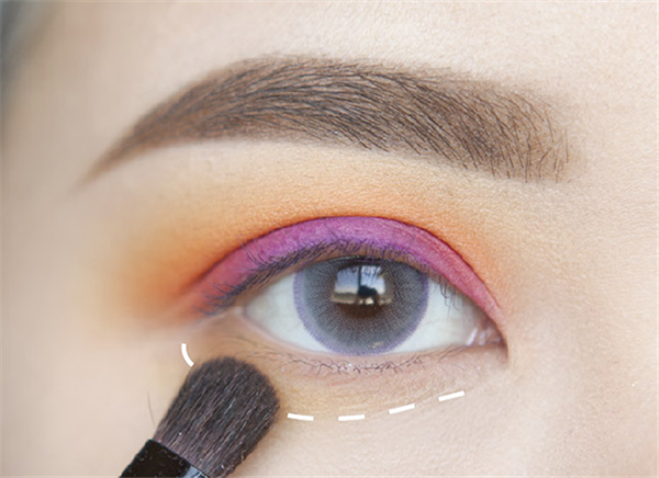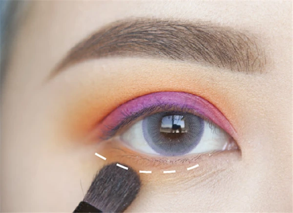 第七步:下眼影的顺序跟上面也是一样的,先用黄色大面积晕染。因为下眼影要和上眼影平衡,所以画的范围一定要大一些。