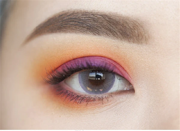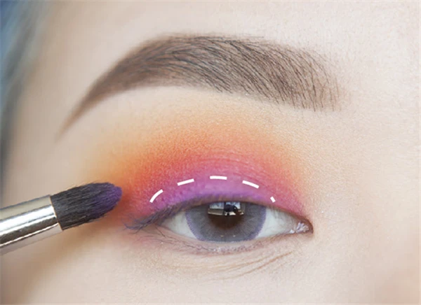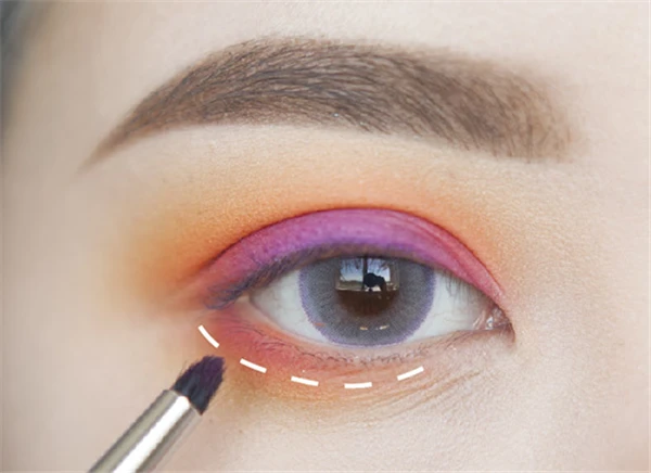 第九步:拿一把小小刷子将桃红色画在贴近睫毛根部的位置,范围比橘色还要小一些。