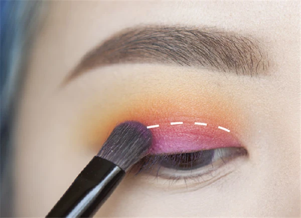 第三步:沾取哑光橘色晕染在比刚才的黄色下面一点点的位置,眼皮中央靠近睫毛位置要空出来。画出来的形状有点像彩虹,就是一层层颜色叠加起来的感觉,边缘跟黄色晕染在一起。