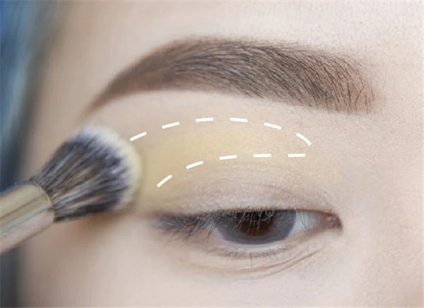第二步:用大晕染刷沾取黄色眼影大面积上在眼窝处,范围比平时的妆要大一些,因为后面颜色叠加在一起的时候边缘能看起来更加自然。可以这一步画完看起来会有点怪,跟着步骤走没错。
