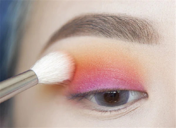 第四步:用舌型或者扁平的晕染刷沾取桃粉色,按压在刚才空出来的地方,范围大概是双眼皮褶皱附近的位置,边缘轻扫跟橘色晕染。可以叠加几层颜色来加重显色度,比较哑光。