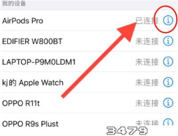 5、找到所连接的AirPods,并点击右侧蓝色图标【i】;