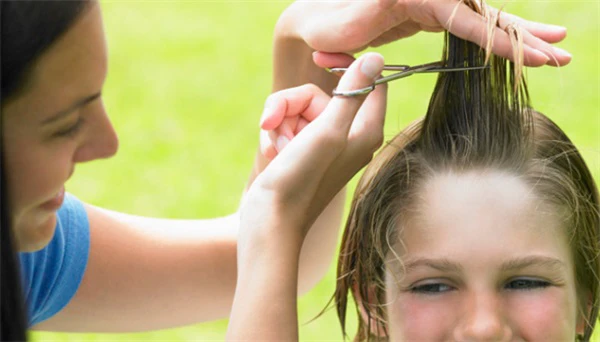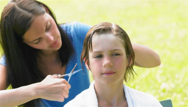 第三步 处理完刘海后,沿着周边的头发进行修剪,直至周边的头发和刘海的长度一致即可。