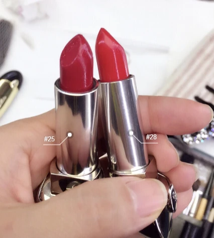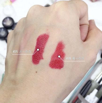 从颜色上面来看:#25是冷色调,冷艳的大红色,看着比较深,但其实上嘴的效果是超正的红。#28是暖色调,调和着橘色,上嘴之后少女感会更强一点,很显气色!