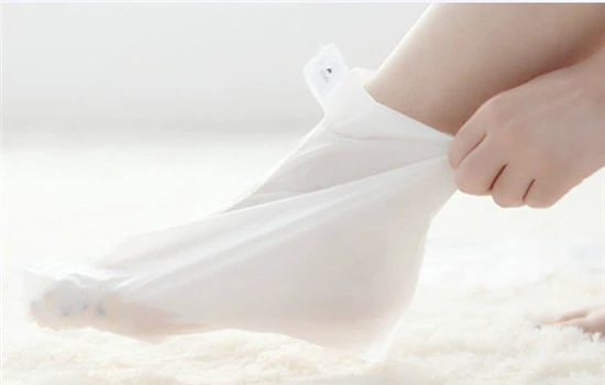 经过了前一步泡脚的步骤,脚上的角质已经软化。这时就可以使用脚膜了,把脚膜剪开,像袜子一样套进去,封住开口。再用手轻压脚膜外层,使精华液均匀流至脚步各处,最后静静等待45分钟就可以了。