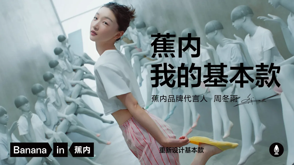 5月底,蕉内正式官宣牵手三金影后周冬雨,由其出任首位品牌代言人,并释出双方共同演绎的“我的基本款”质感大片。6月6日,蕉内更重磅发布与周冬雨合作的全新品牌广告片,灵动演绎“能给生活带来更高品质的,才算我的基本款”。