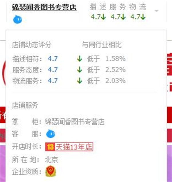 锦瑟闻香图书专营店天猫店的评分不算高,描述相符4.7-,低于同行业1.58%,服务态度4.7-,低于同行业2.52%,物流服务4.7-,低于同行业2.03%。
