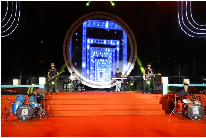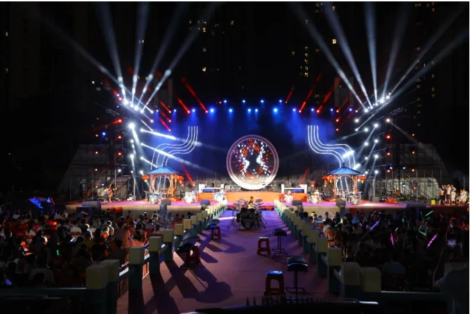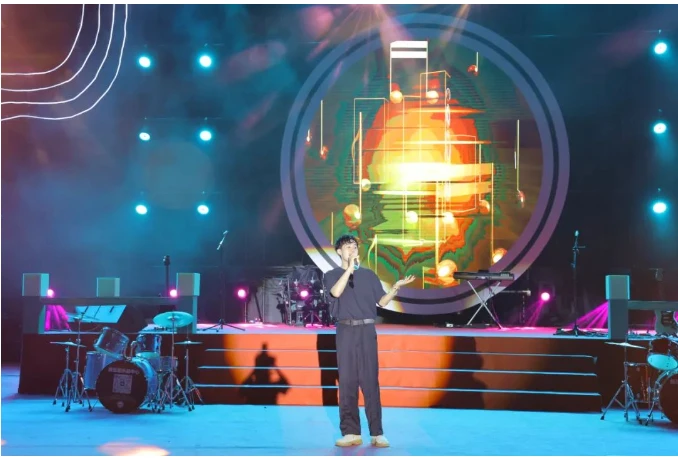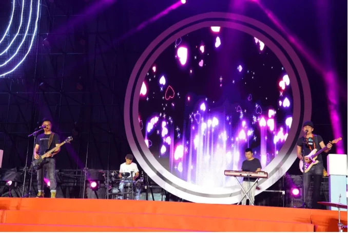 夜幕降临,霓虹闪烁音乐会在虫子乐队带来的歌曲《红日》中热情开唱。