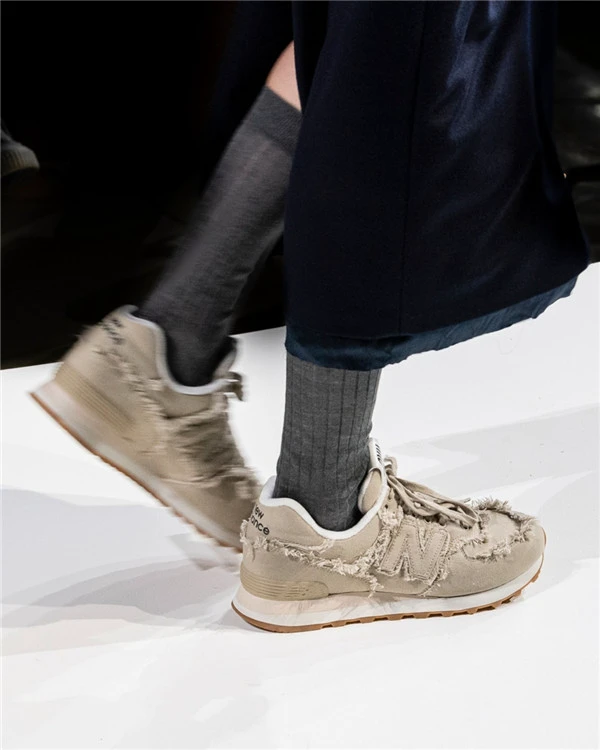 仔细回顾一次Miu Miu Spring Summer 2022时装秀,Miuccia Prada决定挑衅性的剪裁服装,将女性回归办公室的模样赋予全新的视角,大胆叛逆的低腰长裤、剪裁俐落的迷你短裙,剪裁过后的毛边被保留下来,重新赋予2000年代的时装美学。其中另一大目光焦点,落在了其中几位模特儿脚上,与New Balance悄悄携手设计一款联名系列New Balance 574,一亮相引起高度关注,稍早便热腾腾上架于官网。