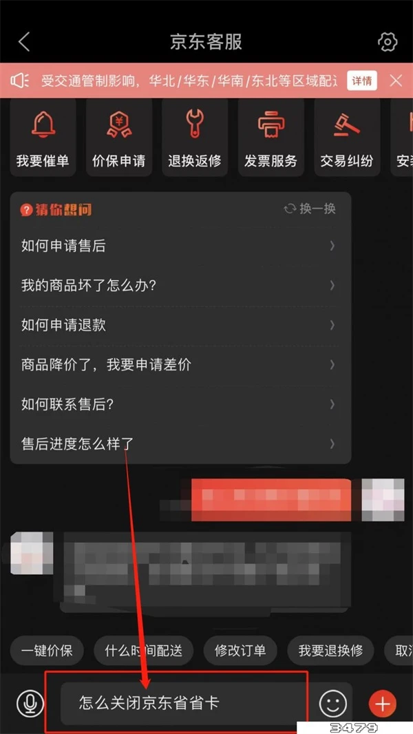 5、在客服对话框中输入【怎么而关闭京东省省卡】,点击发送后,根据客服提示进行操作即可。