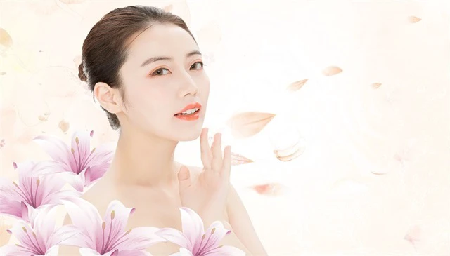 3、将掌心中的精华面霜涂抹于面部肌肤,再用指腹轻柔按压面部肌肤与颈部肌肤即可。