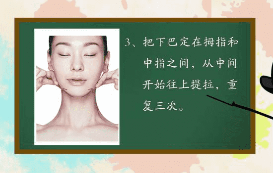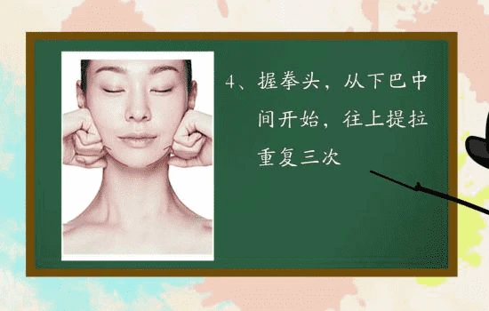 双手轻轻握拳,将拳背放在下巴中间,从下巴中间开始沿着脸部边缘轮廓,往上轻推至耳根处,中途可以轻轻按压脸部,切记不要太用力哦。