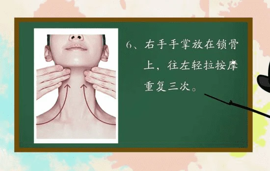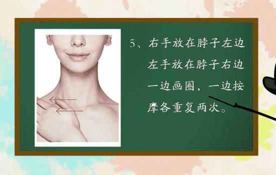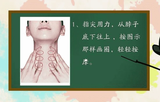 以锁骨中间为中心,将手掌舒展开来,把右手放在脖子左边,左手放在脖子右边,一边向脖子中间画圈,一边轻轻按摩,一般10圈为一次,重复两次。