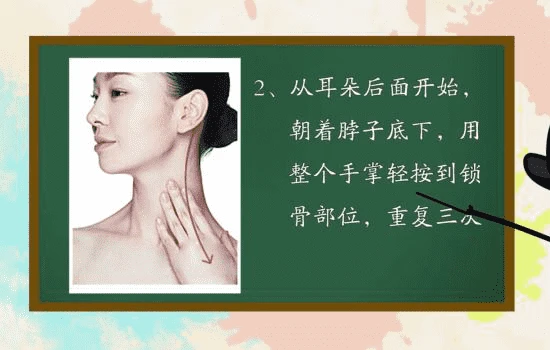 头部微微抬高,从耳朵后面开始,用整个手掌顺着脖子轻轻按压至锁骨部位,各位小仙女记得动作一定要轻柔哦。