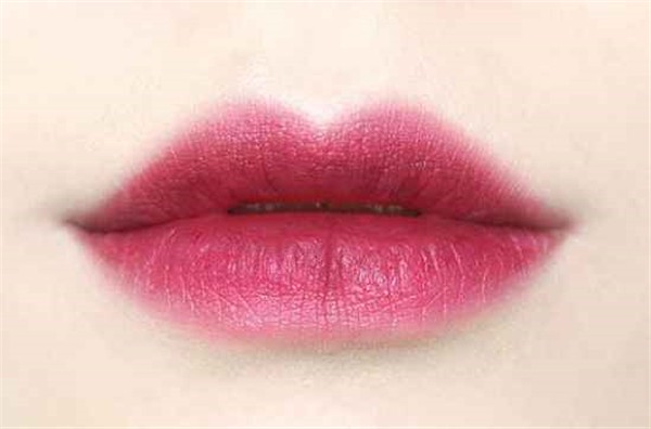 第七步:姨妈色厚厚先薄涂一层,然后用口红在唇峰之间画心型,增加唇峰弧度。突出中唇珠,在嘴唇内侧涂上口红。嘴角向外拉伸并上扬,为了突出中唇珠,在唇两侧厚涂,唇中央画一条竖线。