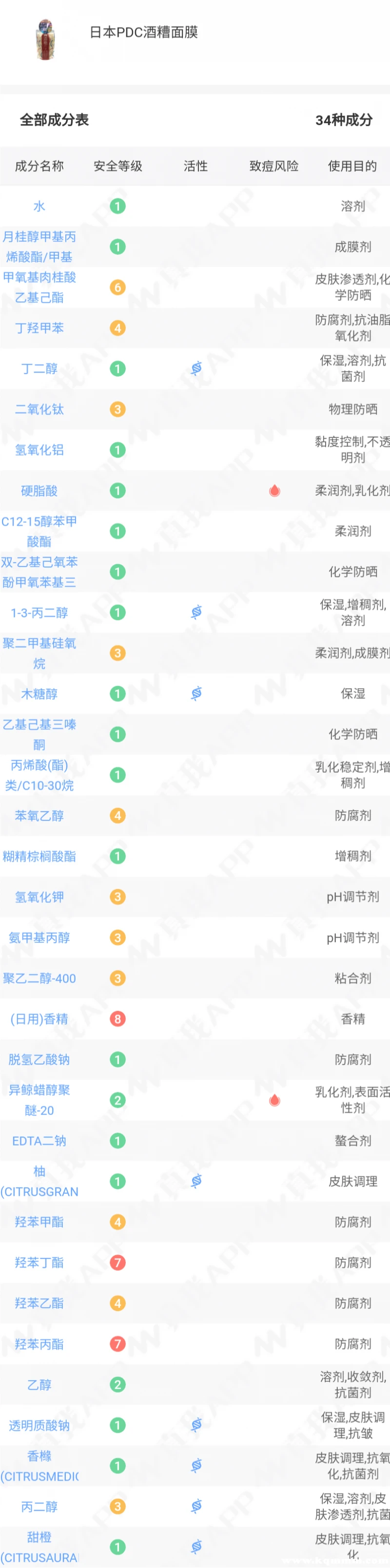 这款面膜当中含有7种防腐剂(丁羟甲苯、苯氧乙醇、脱氢乙酸钠、羟苯甲酯、羟苯丁酯、羟苯乙酯、羟苯丙酯)和1种香精,怪不得有那么多的网友使用完之后会出现过敏现象。而且,其中还含有一种孕妇慎用的成分~甲氧基肉桂酸乙基己酯。