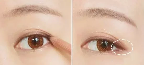 第五步:再用珠光色眼影将眼睑前部分,白色虚线内提亮一下,打造出迷人亮眼,到这步就完成了眼妆眼影的部分,