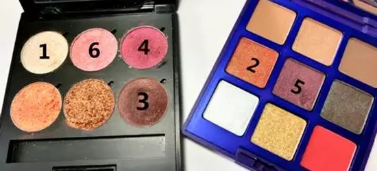 这是本次介绍的眼影妆容用的眼影,分别是爱茉莉的monoeyes眼影和pony的眼影盘,这淡妆眼影用两个颜色就行了,然后加珠光稍微提亮一下,下面的1-6号色是两款淡妆眼影要用的颜色。