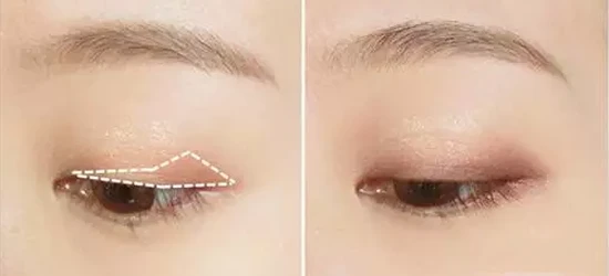 第一步:这款是粉嫩色系的眼影,首先我们就选用4号粉红色眼影,用眼影刷涂抹均匀,在上眼皮打底,能使后续眼影晕染更加顺畅。上色部分就是下图虚线范围内,由深到浅自然地过渡一下。