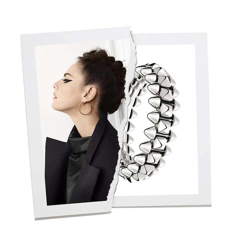 卡地亚大胆运用标志性几何元素:铆钉、圆珠及方形饰钉,以俏皮灵动的姿态呈现Clash de Cartier系列。锋芒毕露,却触感柔和;造型大胆,却灵巧柔润;Clash de Cartier系列将矛盾化为统一,绽放双面魅力:一面柔美耀眼,一面自由果敢。