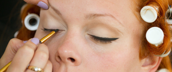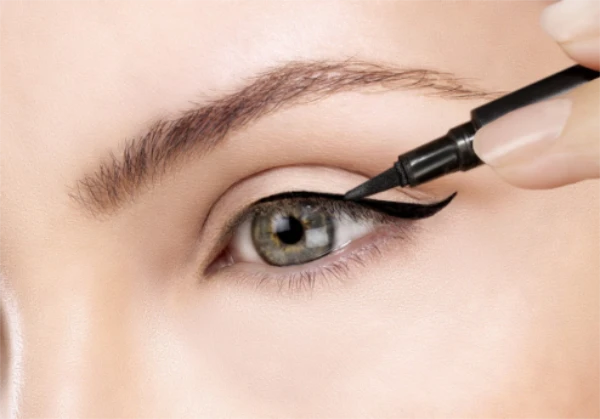 第一笔从眼尾开始,角度微微上扬,约比眼角高0.5公分。张开眼平视镜子时,建议眼线多出眼尾0.5公分即可。若不小心超出或失手,可用棉花棒擦试调整。画内眼线时,手指在眼尾上方微微往上提拉。切忌整个眼线不能相同宽度,从眼尾到眼头是由粗渐细!眼头几乎是微微点上而已,眼头则是线条最宽的位置。接着用眼线笔在眼尾到眼球中央的位置,轻轻来回画,制造一点点阴影。