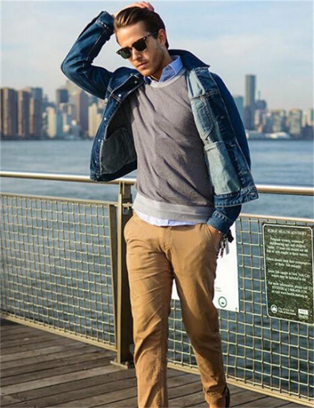 牛仔衣绝对是秋季男生们必备的经典款式,搭配卡其色的长裤就非常帅气。在领口搭配一条同色系深色印花的领巾,绝对让你时髦度提升几个level。整体造型细节的搭配更能体现你的穿搭功力呢!