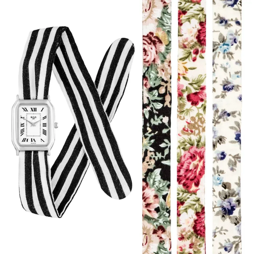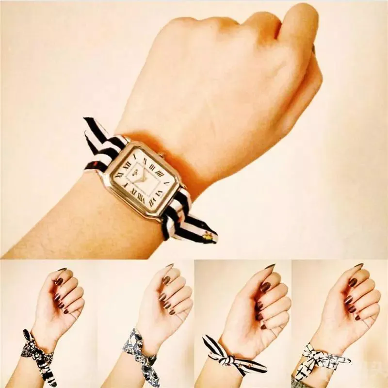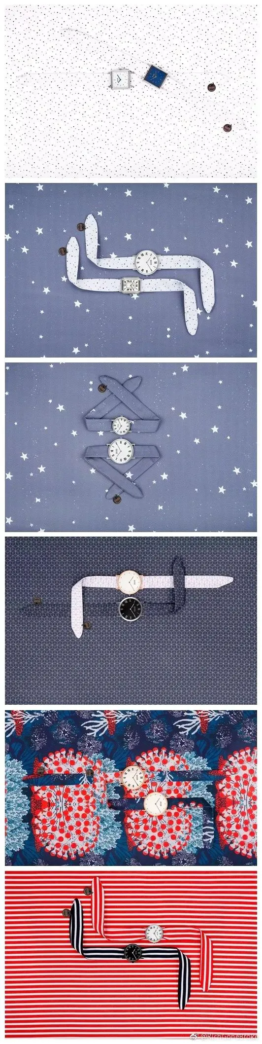 更换表带的方式简单极了,只需将长条形、丝巾般的表带从表耳中抽出来,再将另一条表带从表耳穿过,系在手腕上,打两个结,几十秒就可以变成模样完全不同的另一枚手表。