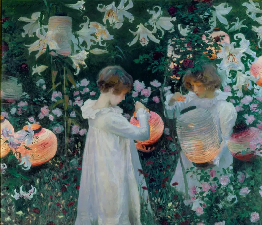 两个身着白衣的小女孩在花园里,灯笼的柔光与日落时的自然光明暗交织,营造出一种纯洁、梦幻的童话意境。
