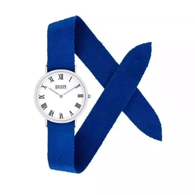 Rich Gone Broke的这一系列表带被命名为“白昼美人Lucy”的系列,宝蓝色菘蓝皮表带,搭配银白色罗马数字圆表盘。