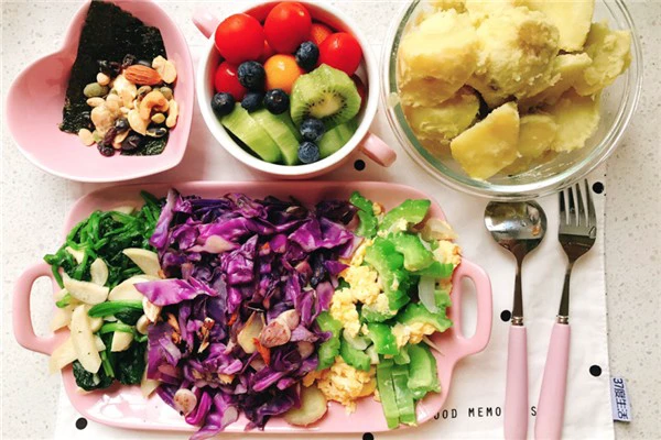 主食可以选择糙米饭、杂粮粥、全麦面包、薯类(紫薯、红薯、山药、土豆等)、南瓜等,可以简单的煮熟或用这些食材做成饼、面包、蛋糕。