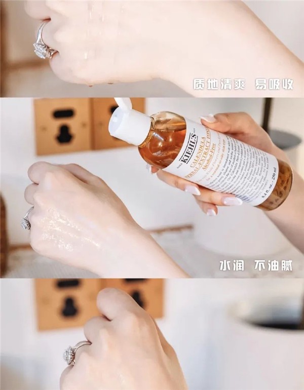 这款金盏花水是科颜氏超级畅销的明星产品,质地是金黄色的透明液体,搭配化妆棉用可以起到二次清洁的作用,直接拍脸,吸收也很快