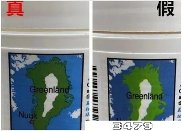 正品科颜氏瓶身上面的地图,地图陆地和海面的边缘有一条黑色阴影,假货则没有。
