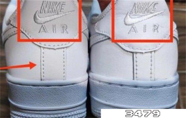 正品空军一号鞋子后面的LOGO刺绣是比较厚重的,有立体感,用手摸能够明显感觉到凸起,仿品鞋子后面的LOGO是比较平整没有立体感的。