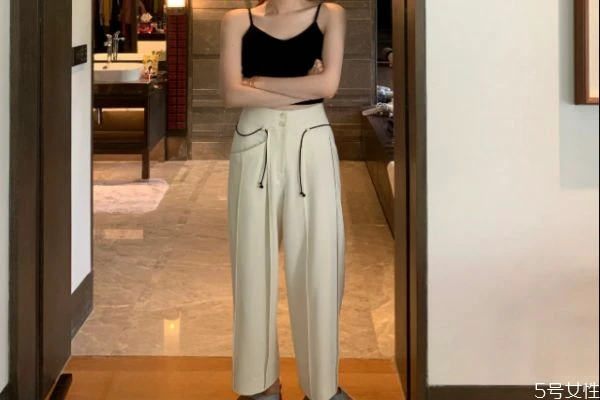 2、阔腿裤搭配背心:无论是短款还是长款背心,搭配阔腿裤线条非常流畅,轻松不费力的搭配球鞋或是凉鞋,在颜色上保持清新的春夏风格,让整体看上去轻盈灵动,在材质上尽可能选择轻薄面料,垂坠的裤腿与随性的背心搭配相得益彰。