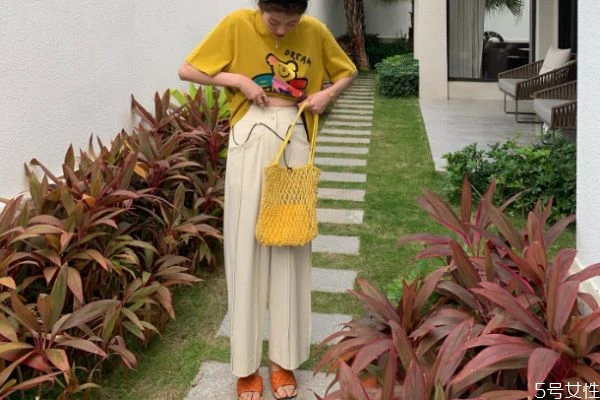 3、阔腿裤搭配宽松上衣:将宽松的衬衫或T恤在腰部位置打个结,就可以轻松DIY出一件带有Oversize效果的收腰短上衣。这样的穿法搭配阔腿裤,格外可以凸显杨柳细腰的摇曳动人。