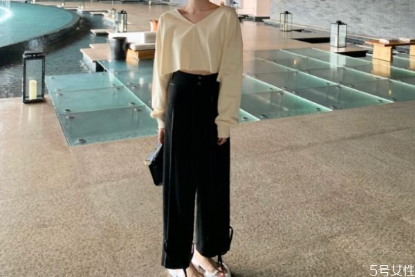 4、阔腿裤搭配短上衣:短上衣+阔腿裤的穿搭中最简单易学的一种,只要你不是瘦的过分胖得离奇,这样的穿搭几乎是任何任何场合任何身材都百搭。
