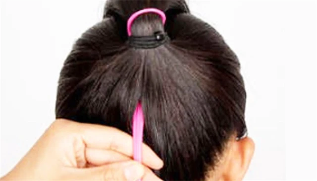 第三步 将马尾和剩下的头发都绑在一起,然后将拉发针从橡皮筋上端穿过,同样将马尾套在拉发针的圈子中,抓住拉发针尖的一端把它拉出来即可。
