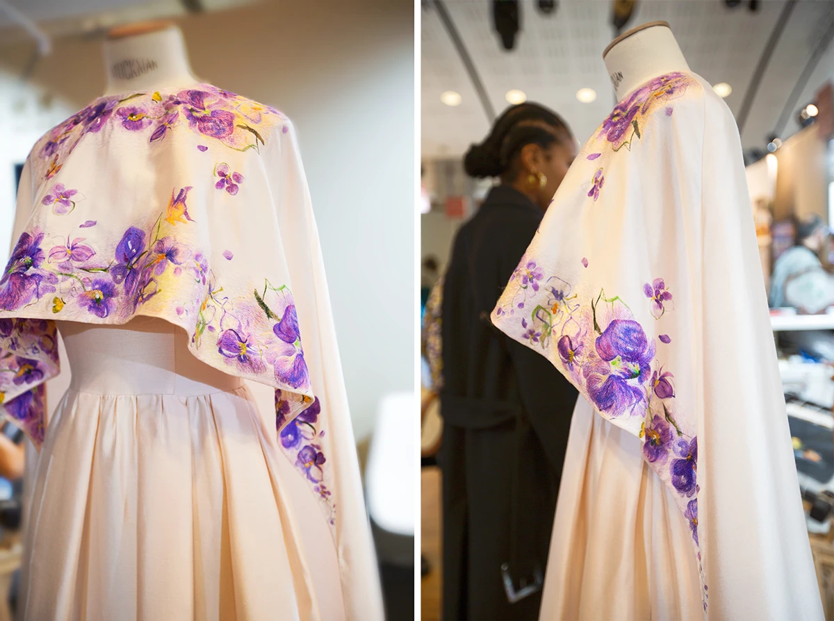 「紫兰花缋」高定礼服,La Koradior拉珂蒂非遗艺术臻藏典籍。灵感汲取艺术家任桃桃联名创作的蝴蝶兰花缋图,艺游未尽,品牌设计顾问Albino Damato以经典斗篷廓形,联合国家级苏绣非遗传承人姚建萍,耗时2160h,展娟为纸,引丝为色,在传统细平绣的基础上融合现代手法,同时为了体现蝴蝶兰灵动美感,在配色上由深至浅,臻选了十八种颜色,每一个细节、针脚,都能感受到东方雕琢精美的气质与西方现代服装文化相融合。
