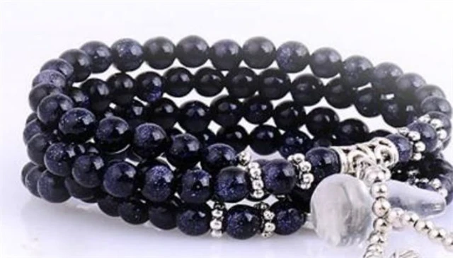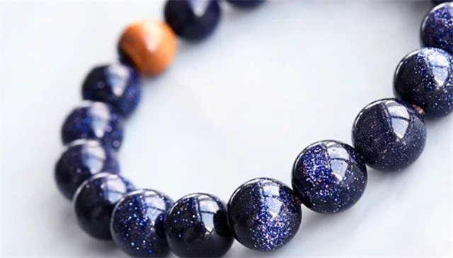蓝砂石是在石英中含有无数蓝色的细鳞片所形成的,每一颗珠子都包含无数的蓝色星星,其蓝光闪闪的,拿在手里从不同角度看会看到星星在闪亮,让人爱不释手。