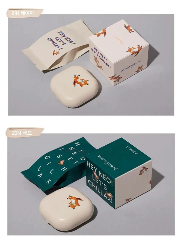 NEO型塑雾感气垫换上奶油白色新装,方块盒上还印了 Maison Kitsuné翘着双脚的可爱小狐狸。这次共推出最受欢迎的两款色号﹕NO21N与NO23N,纸盒外包装分白采用奶油白与深秋绿和满满的小狐狸印花搭配,看似低调简约却超有质感的设计,让粉丝们光是看到画面就惊叹实在太高级!