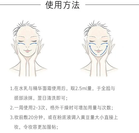 因为属于睡眠面膜,适合在我们入睡前敷,可以敷完后不清洗直接入睡,第二天早上起来用清水洗净即可。