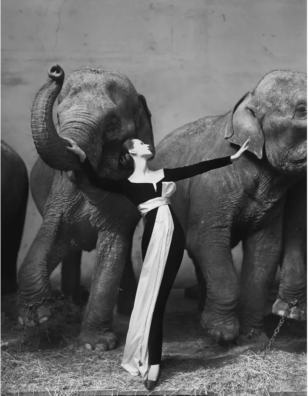 《多维玛与大象》(Dovima with the Elephants)——这幅阿维顿一生中最著名的时尚摄影作品,就是他在《时尚芭莎》工作期间完成的。当时的著名模特多维玛(Dovima),穿着法国时装设计大师克里斯汀·迪奥(Christian Dior)设计的高级定制晚装,在马戏团与一群拴着脚镣的大象合影。画面构思巧妙:女人与猛兽,纤细柔弱与粗糙简陋,现代与原始;元素一分为二,形成巨大的视觉反差。